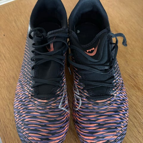 Fotballsko med knotter i flerfarget mønster med hovedfarge svart og kontrastfarger i rosa/oransje. Skoene har snøring foran og faste plastknotter under sålen, egnet for spill på gress eller kunstgress. Passer som fotballsko til trening og kamp.