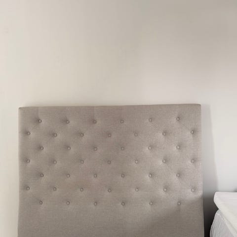Meget pent brukt sengegavl i grått linstoff | 160 cm bred