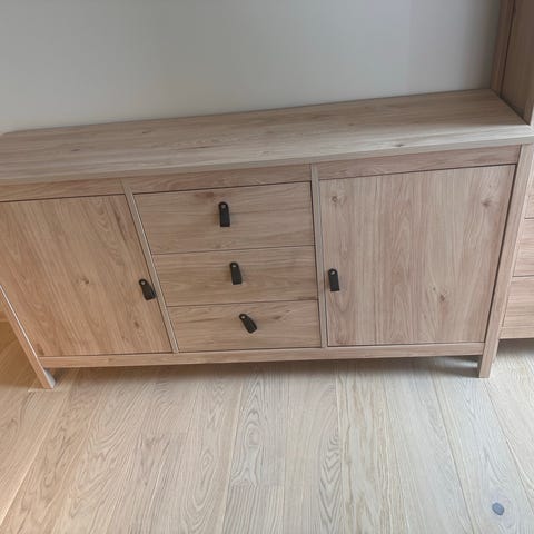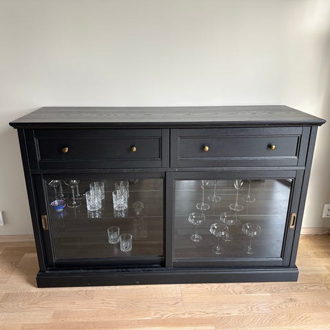 Pent brukt skjenk med noen synlige bruksmerker inni skapet.
