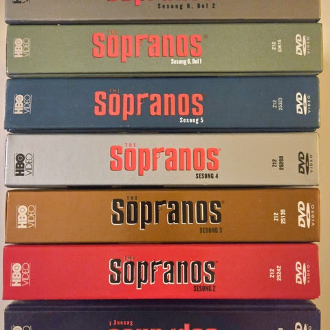 HBO The Sopranos komplett serie DVD-boks. Pakken inneholder alle sesonger av TV-serien samlet i individuelle DVD-bokser. Hver sesong leveres i egen eske med omslagsbilder og episodeinformasjon.