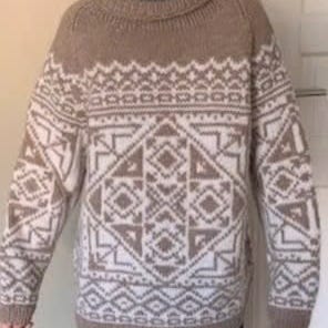 Nystrikket lys grå genser med mønster i koksgrå, modell Dale Cortina med rundfelling, strikket i Gjesdal Rubin, 100% ull, superwash. Vid modell.