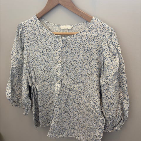 Vero Moda bluse for dame i størrelse S. Blusen er beige med småmønstret trykk og er laget i polyester. Den har 3/4-lange ermer og knappestolpe foran. Innsnitt og strikk i livet gir en lett innsvinget fasong. Passer til hverdagsbruk og kan kombineres med både bukse og skjørt.