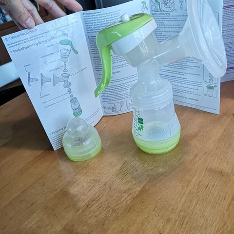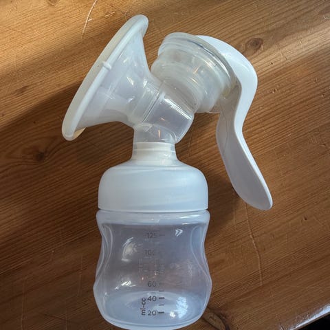 MAM Manual Breast Pump brystpumpe med flaske i grønn og hvit plast. Settet består av manuell brystpumpe med håndtak, trakt, oppsamlingsflaske med motiv og smokk, samt ekstra flaskesmokker. Brystpumpen kobles direkte til flasken slik at melken kan oppbevares eller gis til barnet fra samme flaske. Produktet er laget i BPA- og BPS-fri plast og er beregnet for ammede spedbarn. Egnet til pumping hjemme eller på farten, og delene kan tas fra hverandre for rengjøring. Lite brukt.