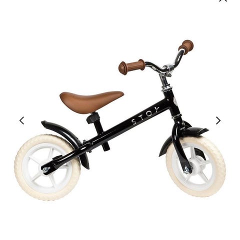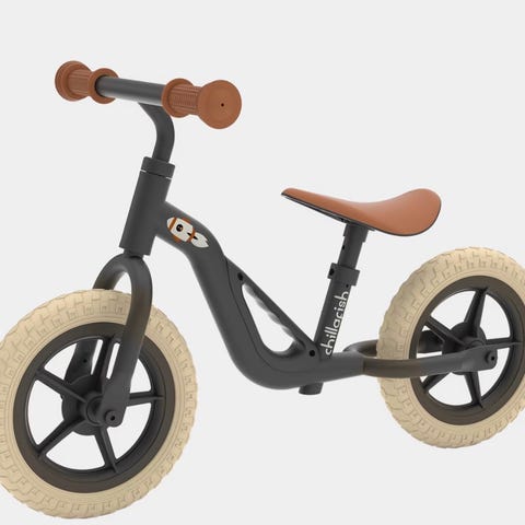 Balansesykkelen har svart ramme med hvite hjul og brunt sete og styreholker. Den leveres uten pedaler og er laget for at barnet skal bruke beina til å sparke seg frem og trene balanse. Sykkelen har skjermer foran og bak.