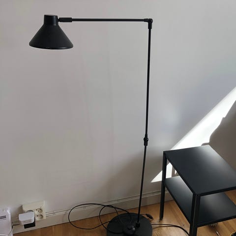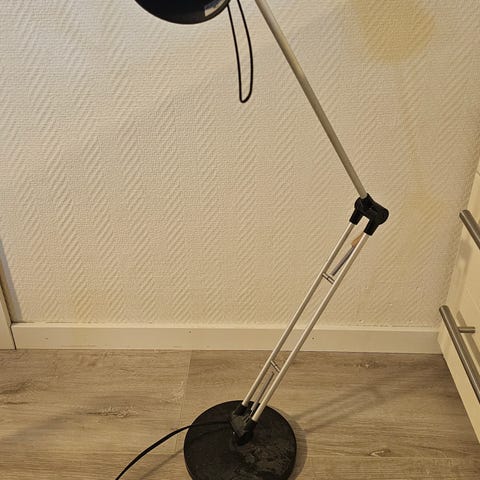 Stålampe i grå. Den kan justeres på to steder og har av/på knapp på "hodet"