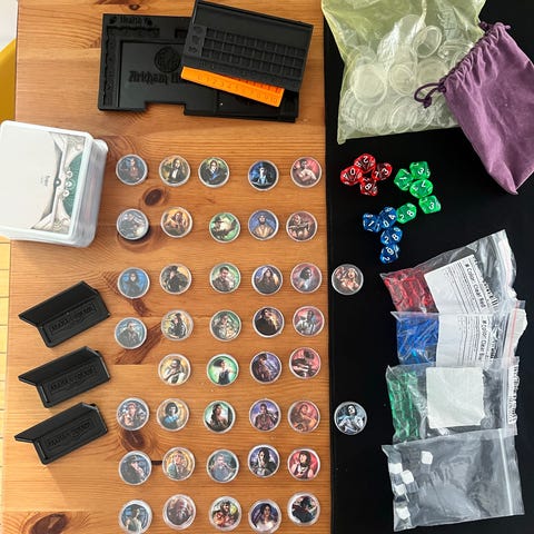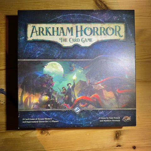 Arkham Horror the card game fra 2016, første utgave. Inneholder alle kort, brikker og regler, samt en pose som kan brukes som chaos bag.