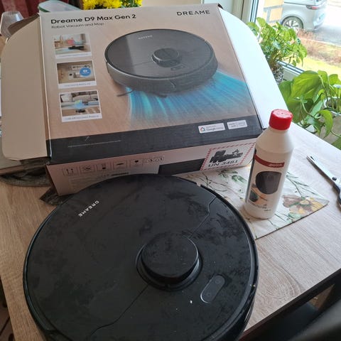 Dreame robotstøvsuger med tømmestasjon i hvit utførelse. Denne har fungert fantastisk bra for meg helt til vi flyttet til eldre bygård med flere høye terskler. Den kommer seg fint over vanlige terskler.