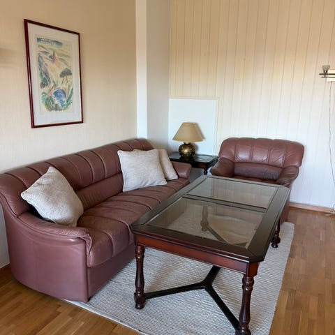 Pent brukt gul skinnsofa med tilhørende glass sofabord selges. Sofaen er komfortabel og i god stand, med et tidløst design som passer i de fleste stuer.