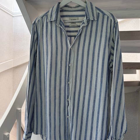 Skjorten er i vevd bomull med blå og hvite vertikale striper. Klassisk skjortemodell med krage, knappestolpe foran og lange ermer med mansjetter og knappelukking. Lett buet nederkant. Egnet til hverdagsbruk og enkel å kombinere med både bukser og skjørt.