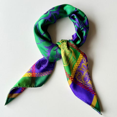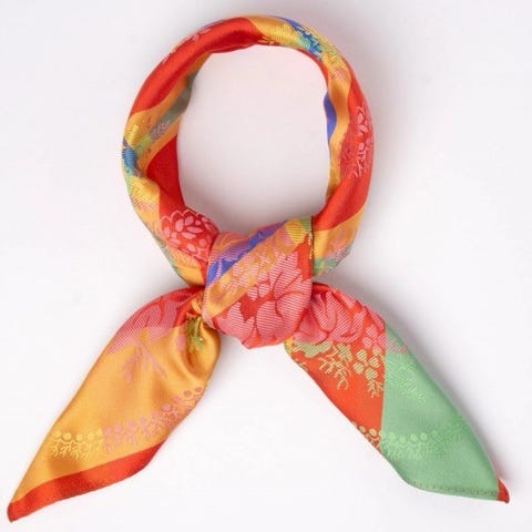 Nydelig silkeskjerf i 100 % silke med flotte toner av oransje, lilla og rødt.