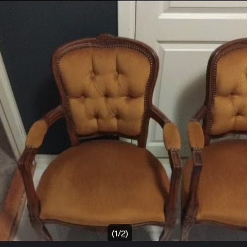 Stolene er pent brukt, men stoffet er slitt ytterst på armlenene og må skiftes der.