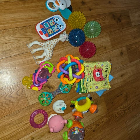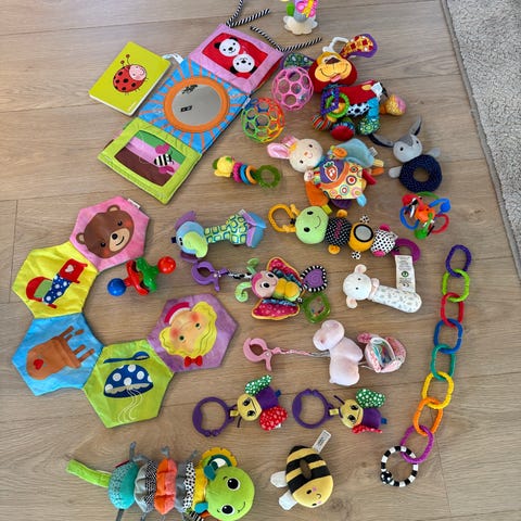 Babyleker blandet pakke. Inneholder myk musikalsk kosebamse samt flere fargerike aktivitetsleker og rangler i plast og tekstil. Lekene har ulike former, teksturer og bevegelige deler som kan gi sanse- og gripeutfordringer for små barn. Egnet som babyleker til bruk hjemme, i vogn eller på leketeppe.