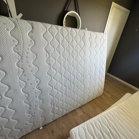 Sengen & madrass er demontert og pakket i plast, klart til henting.