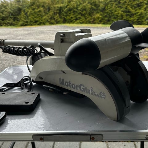 Baugmontert trollingmotor med GPS-styring (i-Pilot). Motoren gir presis posisjonsholding (Spot-Lock), autopilot og trådløs styring via fjernkontroll.