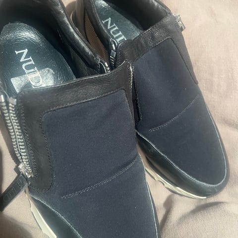 Nude of Scandinavia sneakers/joggesko i størrelse 39. Modellen er slip-on med brede elastiske remmer over vristen og hempe bak for enklere av- og påkledning. Skoene er i svart tekstil- og skinnmateriale med kraftig, hvit såle i gummi. Egner seg til hverdagsbruk og fritid.