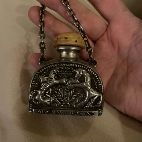 Liten lommelerke i tinn med relieffmotiv på for- og bakside. Ca 10 cm inkl. kork.