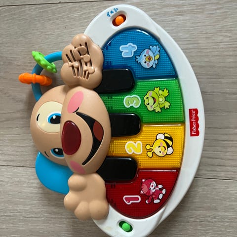 Fisher-Price hund piano leke med lys og lyd. Leken har fire fargede tangenter med tall og figurer som lyser opp når de trykkes ned. Den spiller ulike lyder og melodier når barnet trykker på knappene. Pianoet har et håndtak øverst som gjør det enkelt å holde for små hender. Egnet som aktivitetsleke for små barn som vil utforske lyd, lys og farger.