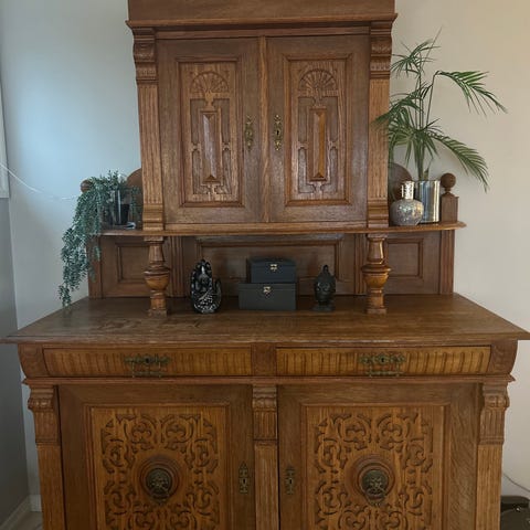 Skatoll/ framskap i tre med utskårne detaljer på fronter og overdel. Møbelet har to skuffer øverst og to dører nederst som skjuler hyllerom med plass til servise eller annet utstyr. Overdelen har en oppbygget rygg med dekorative søyler og utskåret mønster. Skjenken står på små ben og har metallbeslag på skuffer og dører. Passer som oppbevaringsmøbel i spisestue, stue eller gang. Møbelet er arvegods og selger kjenner ikke til hvem som har produsert dette. Lås til underslag må justeres og det følger kun 1 nøkkel med. Overdel kan tas av, søyler og ben likeså.