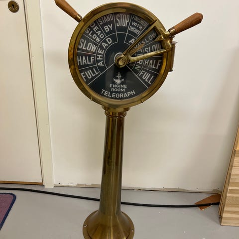 Selger denne stående maskintelegrafen fra Chadburns Liverpool, ca 1 meter høy. Orginalt messinghus, spak og skive.