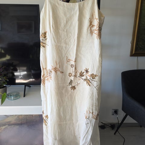 Deilig kjole i lin til sommeren. Vid model med lengde til under knærne., den har 2 lommer. Deilig å ha på, men dessverre ikke helt min fasong.. fargen er dueblå. Selges for 500,- gi bud
