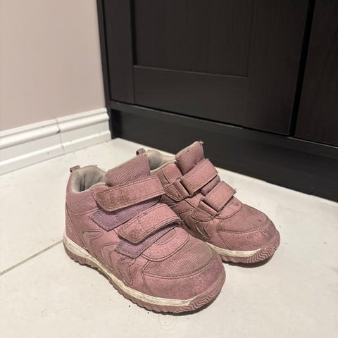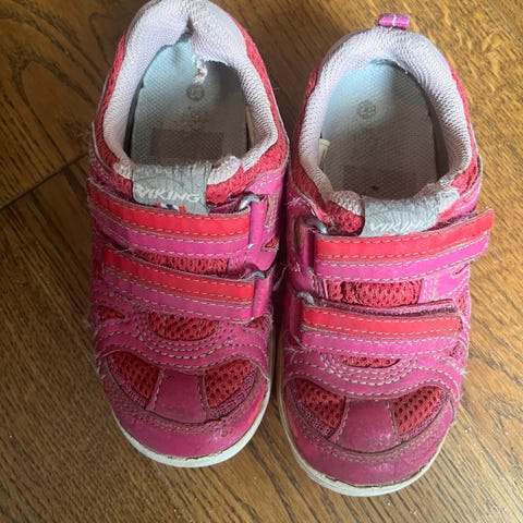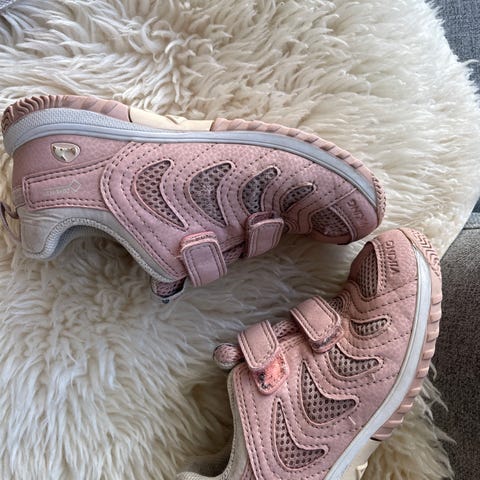 Viking Cascade GTX (Goretex) joggesko for jente i størrelse 28. Skoene er i en dus rosa tone med overdel i pustende mesh og tekstil. De har tre borrelåsremmer som gjør dem enkle å ta av og på, samt en fleksibel yttersåle med mønster for bedre grep.
