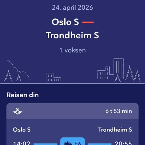 En honnør togbillett Oslo - Trondheim den 23.03.2026 avreise kl 10.02 selges pga endret planer.