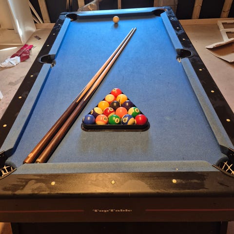 Trebord biljardbord godt brukt, bruktmarked finnes. Må sikkert fikse litt på kantene. Ellers den er fin.