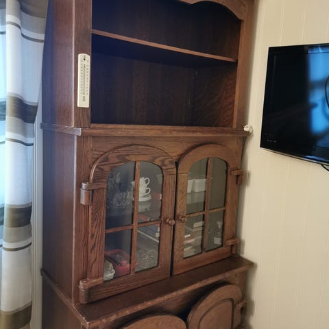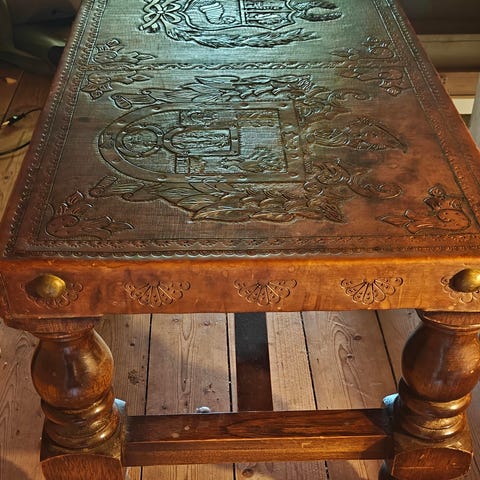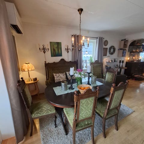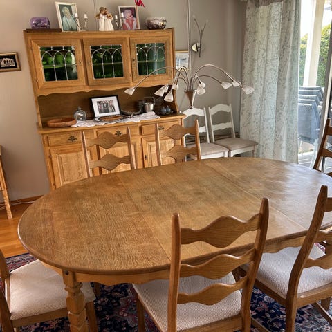 Spisebord i massiv eik, med tilhørende stoler. Innleggsplate til bordet følger med. Tilhørende vitrineskap i samme serie. Håndskåret. Flere bilder og mål kan gis ved etterspørsel. Ønsker å selge samlet, men kan også selges hver for seg. Pris er for alt, kan diskuteres. Må hentes.