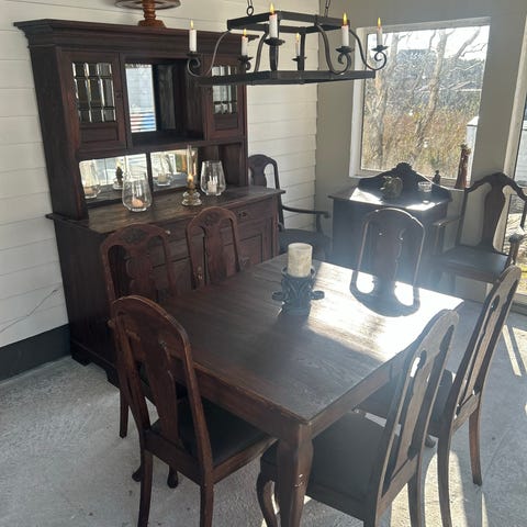 Spisebord i massiv eik, med tilhørende stoler. Innleggsplate til bordet følger med