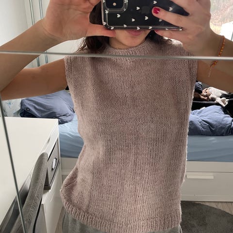 Selger denne kjempesøte, hjemmestrikkede vesten. Den er strikket i tynt og fint, lyseblåt garn av ull. Den er myk, og klør ikke! Er en ca. Str M, men er god og stretchy, så kan nok passe S-L. Lite og pent brukt, ingen merker.