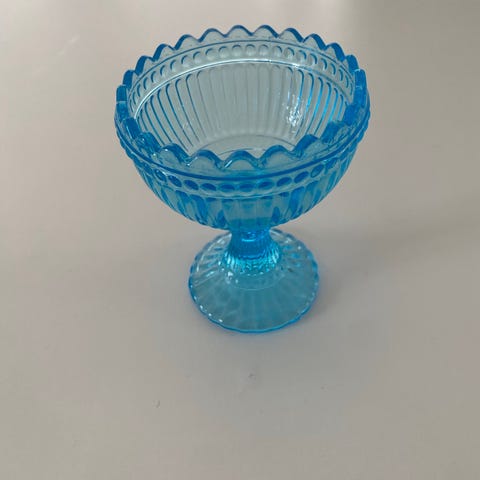Selger en vakker liten stettskål i lyseblått pressglass, høyde ca 9,5cm. Ingen skader. Kan sendes med Postnord kr 69,-