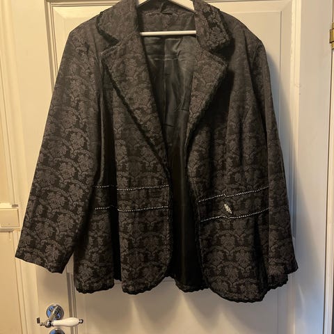Ubetydelig brukt sort jakke i fløyel selges. Kroner 300 + porto. Fine detaljer.