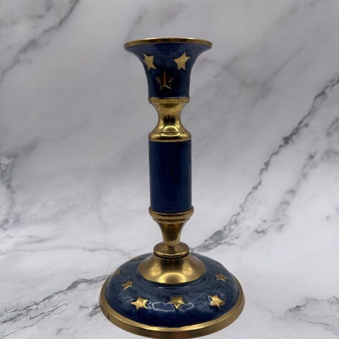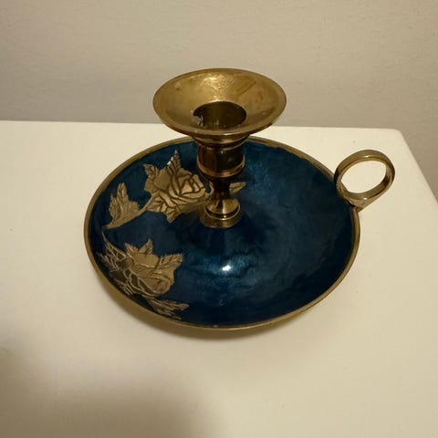 messing lysestake, emalje lysestake, vintage messing, retro lysestake, mid century, norsk design, retro interiør, skandinavisk design, blå emalje, vintage dekor, retro hjem, 60 tallet interiør