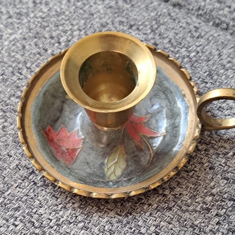 Fin liten lysestake med ringhåndtak, typisk for skandinavisk design fra midten av 1900-tallet. Emaljen gir et flott fargespill mot den varme messingen.