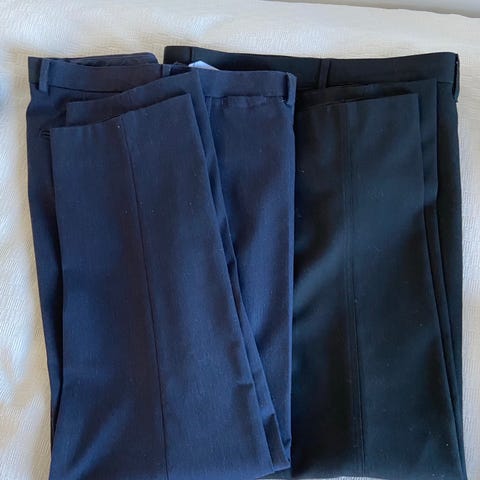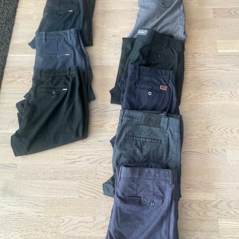 Dressmann bukser for herre i diverse størrelse, se ovenfor. Den i 40/30 er ubrukt. Buksene er i bomull, 2 stk i sort, 1 stk i mørk grå. Klassisk modell med lommer foran og bak, samt beltehemper i linningen. Passer til hverdagsbruk eller som en enkel penbukse, avhengig av hvordan de kombineres med øvrige plagg, sendes ikke.
