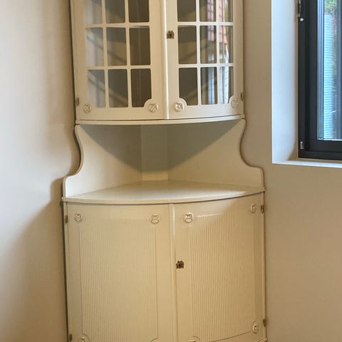 Hvit reol med benk og vitrine
