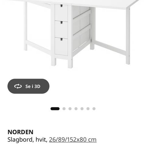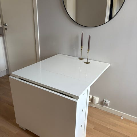 Har bruk den til å ha på mitt student rom, den er pent brukt og alle hyllene er på plass den kan legges ned på begge sider og passer fint til å ha på et rom etter som et kjøkken bord som den er originalt er ment for!