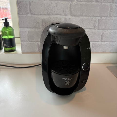 Bosch Tassimo kapselmaskin i svart utførelse. Maskinen er beregnet for bruk med Tassimo-kapsler og har avtagbar vanntank på baksiden. Fronten har knapp for betjening og avtagbart dryppbrett. Kompakt modell som tar liten plass på kjøkkenbenken. Egnet til tilberedning av ulike varme drikker som kaffe, te og kakao ved bruk av kompatible Tassimo-kapsler.