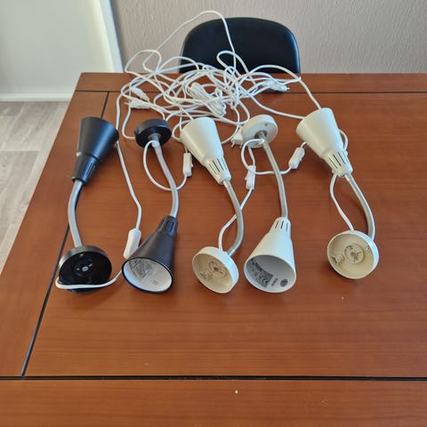 IKEA vegglampe grå. Lampen har skjerm i metall og monteres på vegg. Den har ledning med bryter og bruker lyspære med maks 7 W, som vist på merkingen inne i skjermen. Egnet som leselys eller arbeidslys over for eksempel kjøkkenbenk, skrivebord eller ved siden av seng. Designet er funksjonelt med justerbar skjerm for å rette lyset der det trengs. Selger også taklampe