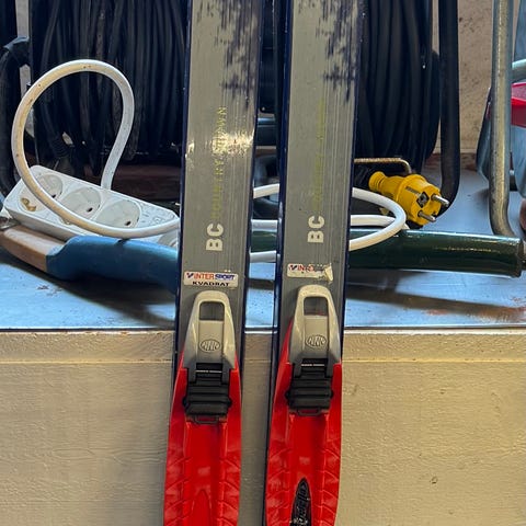 Salomon alpinski med bindinger. Nøyaktig lengde er ikke oppgitt og må eventuelt måles.