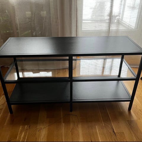 Gir bort en svart tv benk i metall, pent brukt. Må hentes.