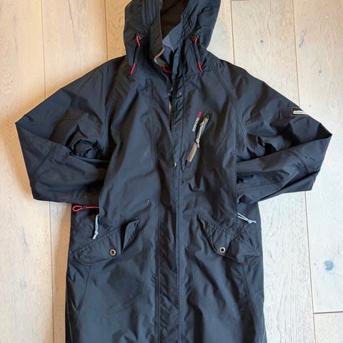 Selger en Didriksons ytterjakke for dame i størrelse 42. Jakken er svart og laget i polyester. Modellen har hette, flere frontlommer med knappelukking og glidelåslommer på brystet. Innsiden har meshfôr og praktiske innerlommer. Passer som annet yttertøy til hverdagsbruk og utendørsaktiviteter. Selger jakken for 549kr