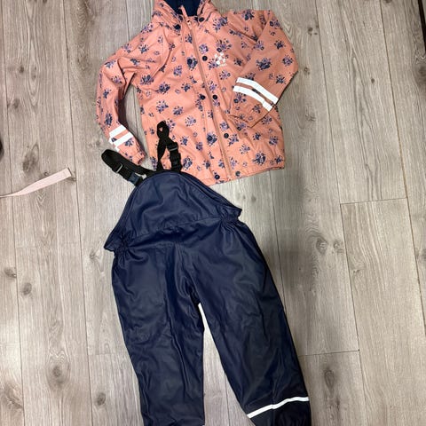 Godt og varmt regnsett fra jula med fleece inni. Perfekt nå til våren og høst. Jakken er i str 122/128 og buksen er i 110/116. Brukt samtidig.