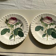 Disse tallerkenene er av typen Roy Kirkham Redouté Rose, laget i England av fint benporselen.