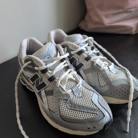 New Balance joggesko i størrelse 45,5. Modellen har overdel i pustende mesh med syntetiske forsterkninger. Skoene er flerfarget med kombinasjon av rosa, mintgrønn, svart og hvit, og har snøring foran. Yttersålen er i gummi med mønster for grep. Egnet som joggesko eller fritidssko.
