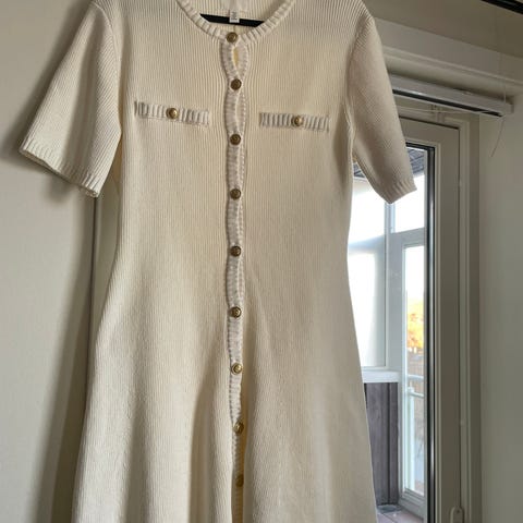 H&M hverdagskjole for dame i størrelse XL. Kjolen er hvit og laget i bomull. Modellen har korte ermer, rund hals og hel knapperekke med knapper foran. Det er dekorative klaffer med knapper på brystet. Passer som en enkel hverdagskjole i en rett og komfortabel passform.