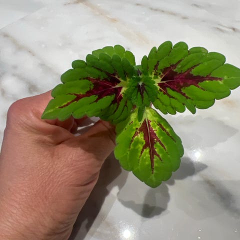 Coleus potteplante med dekorative blader i grønn og burgunder farge. Planten har kraftige, taggete blader med lysere midtnerve og kontrastfarger. Egner seg som inneplante i potte, for eksempel i vinduskarm eller på hylle med godt indirekte lys. Trives i jevnt fuktig jord og romtemperatur. Passer både alene i potte eller sammen med andre grønnplanter.