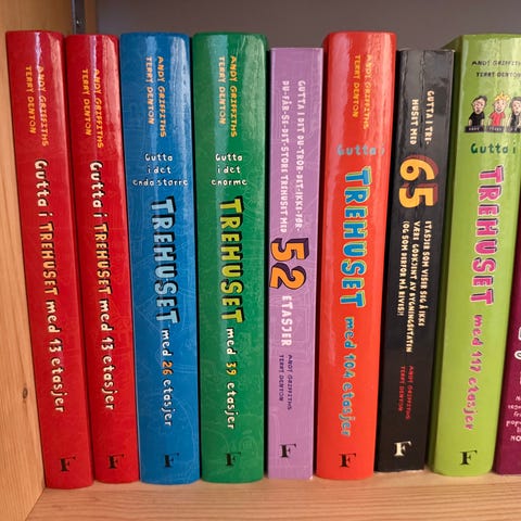 Andy Griffiths og Terry Denton bokserie Gutta i trehuset. Bøkene på bildet viser flere titler i serien, blant annet ulike utgaver av «Trehuset» med forskjellig antall etasjer. Innbundne barnebøker med fargerike rygger. Passer for barn i skolealder som liker humoristiske og illustrerte bøker. Antall bøker og eksakte titler følger det som vises på bildet.