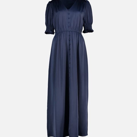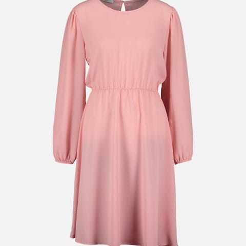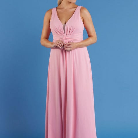 Lekker og sommerlig maxikjole i mykt stoff med blomsterprint og halvblank finish. Den har en rosa bunn med både lysere og mørkere områder som skaper et delikat spill i fargene. Stoffet har veldig god stretch og er noe tungt, så kjolen faller pent. Den har v-hals i omslag og gir fleksibel brystvidde .