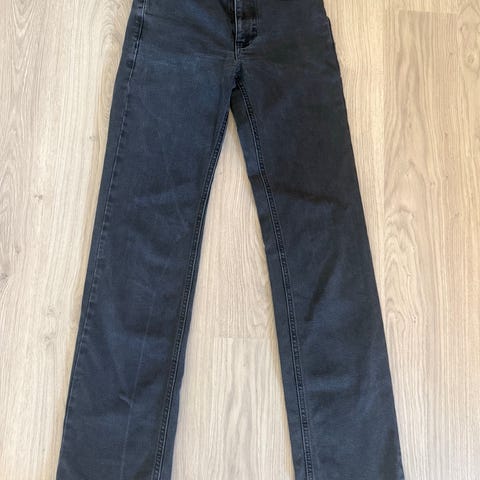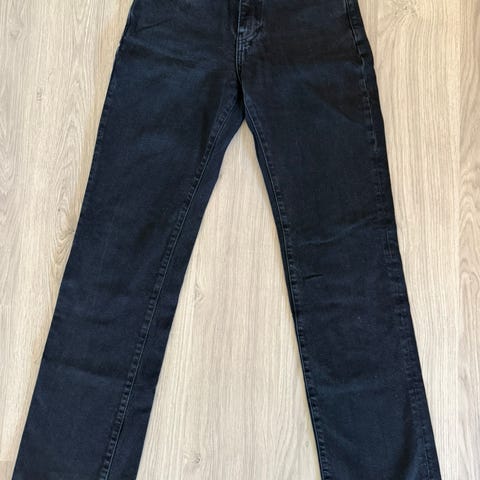 Mid Wide jeans fra bikbok i størrelse S (W25/L32). Svart denim i bomull. Femlommersmodell med glidelås og knapp. Brukt 3-4 ganger. Liten flekk foran (kan trolig vaskes bort).